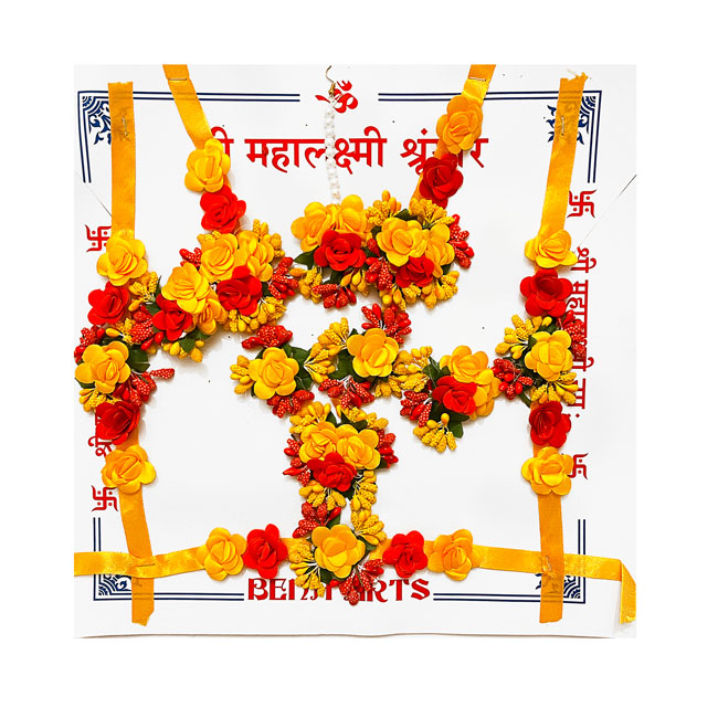 In a godh bharai (गोद भराई) or valaikappu (வளைக்காப்பு), the mother-to-be is celebrated with flowers, bangles, and blessings. This artificial flower jewellery set in red and yellow rose design captures the joy of the occasion. In Telugu families, it is worn during seemantham, while in Bengal, mothers are adorned with floral accessories for *shaad* rituals. Easy to wear, lightweight, and vibrant, this set ensures the glow of tradition without worrying about fresh flowers fading. A symbol of fertility and happiness, it adds grace to every celebration and creates memories that last a lifetime.