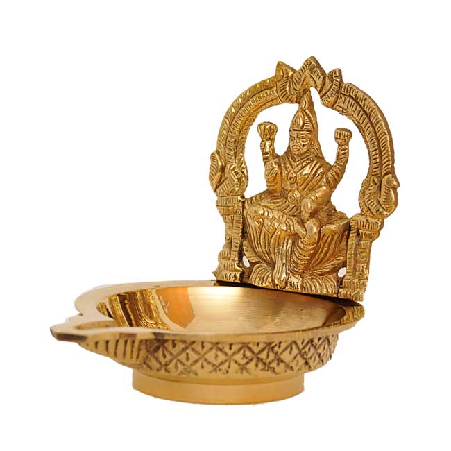 Diya is an important worship accessory used in Hindu ceremonies. This brass metal diya contains a large oil pot with a beautifully hand-crafted idol of goddess Lakshmi. Goddess Lakshmi symbolises wealth and prosperity in Hinduism.