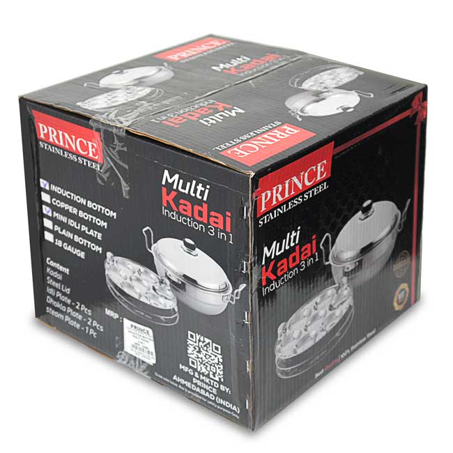 Prince Multi Kadai 3-in-1 mit Induktionsboden aus Edelstahl ist ein hochfunktionales Küchengerät, das für unterschiedliche Kochanforderungen entwickelt wurde. Es besteht aus hochwertigem Edelstahl und verfügt über einen Induktionsboden, der sowohl mit Induktionsherden als auch mit herkömmlichen Kochfeldern kompatibel ist. Dieses Multi-Kadai-Set umfasst einen Kadai, einen Stahldeckel, zwei große Idli-Teller, einen Mini-Idli-Teller, zwei Dhokla-Teller und einen Dampfteller für Patra und bietet wichtige Werkzeuge für die einfache und effiziente Zubereitung einer Vielzahl traditioneller Gerichte.