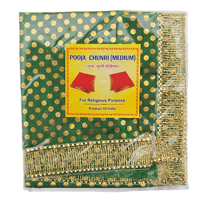 Puja Chunri ist ein dünnes dekoratives Stück Stoff, das für günstige Anlässe verwendet wird, um Götzenbilder von Gottheiten zu bedecken, und als Basis für Dekorationen wie Mata ki Chowki. Dieses Puja Chunri ist aus grünem Stoff mit goldbedruckten Blumen und einem dekorativen Goldrand.