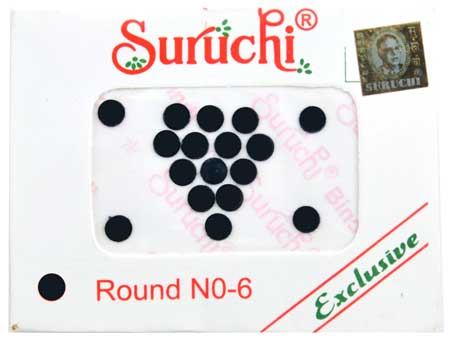 Bindi-Aufkleber sind modische Accessoires, die gut zu traditionellen indischen Kleidern passen. Bindi ist ein Punkt, der in der Mitte der Stirn getragen wird. Die Suruchi Bindi Packung enthält 17 runde Bindi-Aufkleber in schwarzer Farbe.