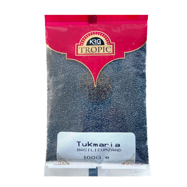 Tukmaria Basilikumsamen, 100 g sind kleine schwarze Samen, die beim Einweichen in Wasser eine weiche, gelartige Hülle bilden. In Indien gehören sie seit Generationen zu erfrischenden Sommergetränken und Desserts und finden auch in modernen Rezepten ihren Platz.