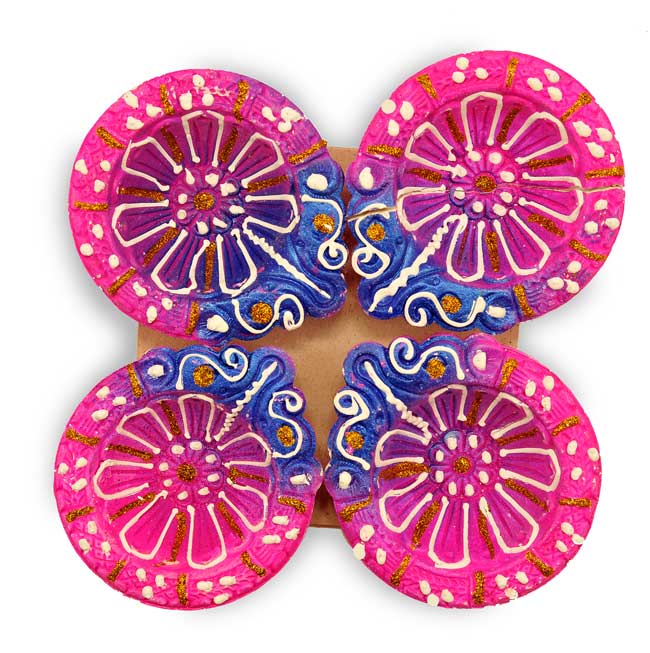 Designer Clay Diya, Pink & Blue round shaped, is a set of four clay lamps that hold immense cultural significance in Hinduism. These diya lamps are traditionally lit on auspicious occasions like Diwali and other rituals and ceremonies. Each diya in this set is handcrafted with utmost care, showcasing an exquisite leaves-shaped design. The bright pink and blue colors used for painting these diyas add a vibrant and joyful touch to any festive ambience.