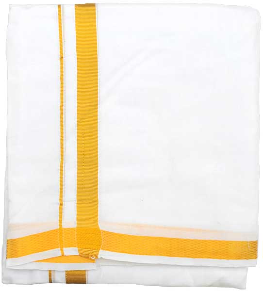 Dhoti est porté sur la partie inférieure du corps. Dhoti et angvastram sont les costumes traditionnels portés par les hommes hindous lors d'occasions propices ou par des prêtres. Ce Dhoti en coton blanc a une bordure dorée. Dhoti est connu sous le nom de Dhuti en bengali, Dhotar en marathi, Dhotra ou Kachcha Panche en kannada, Panchey ou Dhovathi en telugu, Veti en tamoul et Vendu ou Mundu en malyalam.