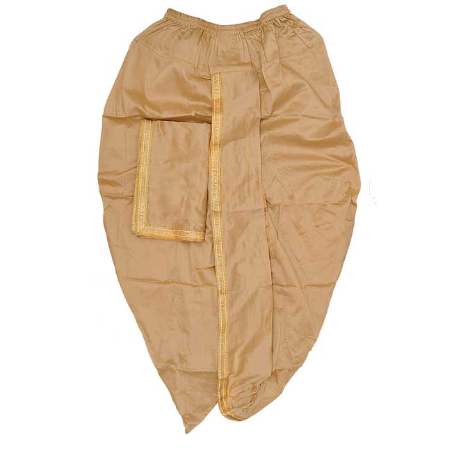 Dhoti est la robe indienne traditionnelle pour les hommes dans toute l'Inde. Cette robe est portée surtout lors des fonctions religieuses et des occasions de mariage. Dhoti est porté à la partie inférieure du corps.Angavastram" signifie littéralement "tissu corporel (couvrant)". porté par les hommes hindous pour couvrir la partie supérieure du corps. Ce Dhoti prêt à coudre est prêt à porter un Dhoti doré qui peut être porté comme un pantalon