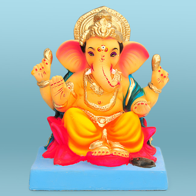 This Eco Friendly Ganpati idol is in a calm & sitting posture of lord Ganesh with his hands in Abhay mudra. This lord Ganesha idol is made with Eco-friendly river sand, paper pulp, natural colours and natural gums.
