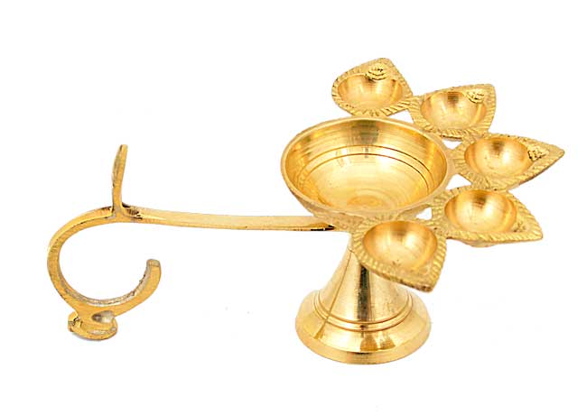 Brass Panch Aarti est une lampe en laiton avec cinq pots diya et une poignée. La lampe panch aarti doit être remplie de comprimés de camphre ou d'huile (et de mèches), elle est agitée en cercle complet devant la divinité.