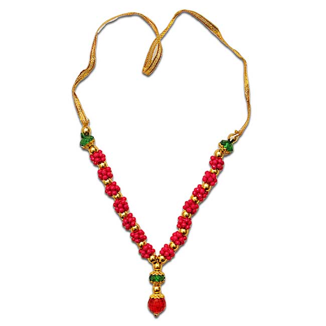 Dans l'hindouisme, le pooja mala est un ensemble de fleurs et de perles colorées utilisées pour effectuer quotidiennement une puja (culte) aux dieux, déesses et objets de méditation. Ce pooja mala est composé de belles perles magenta, reliées par des perles dorées et vertes (artificielles). C'est une excellente offrande pour toute divinité ou objet sacré dans votre maison.