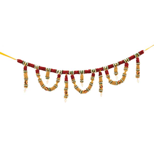 Toran, Toranam ou Bandanwar est une œuvre d'art décorative et un accroche-porte. Toran est une décoration d'intérieur utilisée lors d'occasions festives de bon augure, de mariages, de pendaisons de crémaillère, etc. pour accueillir les invités ainsi que la déesse Laksmi, la déesse de la richesse et de la richesse. Prospérité Ce Toran se compose de perles d'or reliées à des imitations de feuilles de manguier et d'un symbole de Ganpati sur chaque feuille de manguier. Lord Ganesha, également connu sous le nom de Ganpati et Vinayaka, est l'un des dieux hindous les plus vénérés. Le Seigneur Ganesha est considéré comme un guide de la science et de l'art ainsi que comme un Deva de l'intellect et de la sagesse. Les feuilles de manguier sont considérées comme de bon augure dans l'hindouisme.
