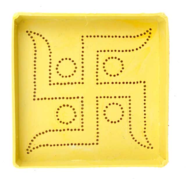 This Rangoli stencil is 8cm x 8cm wide and makes a the traditional Swastik which is a must have in any auspicious Hindu ceremony. Swastik is considered to be an auspicious symbol of symbol of divinity and spirituality.